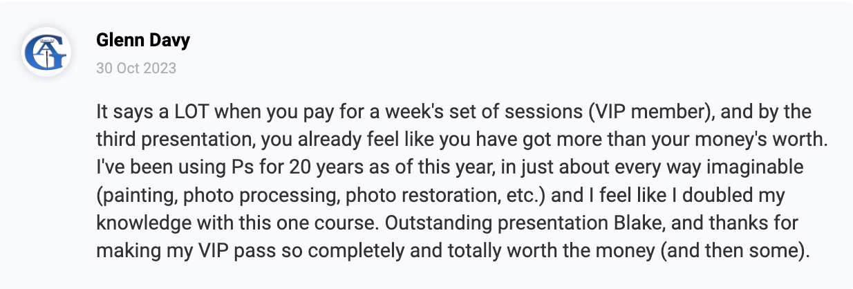 Once each class goes live, it will be available to watch for free for 48 hours. With LIFETIME ACCESS, the VIP Pass means you never worry about missing a single nugget of wisdom from the Photoshop Creativity Virtual Summit 2025.