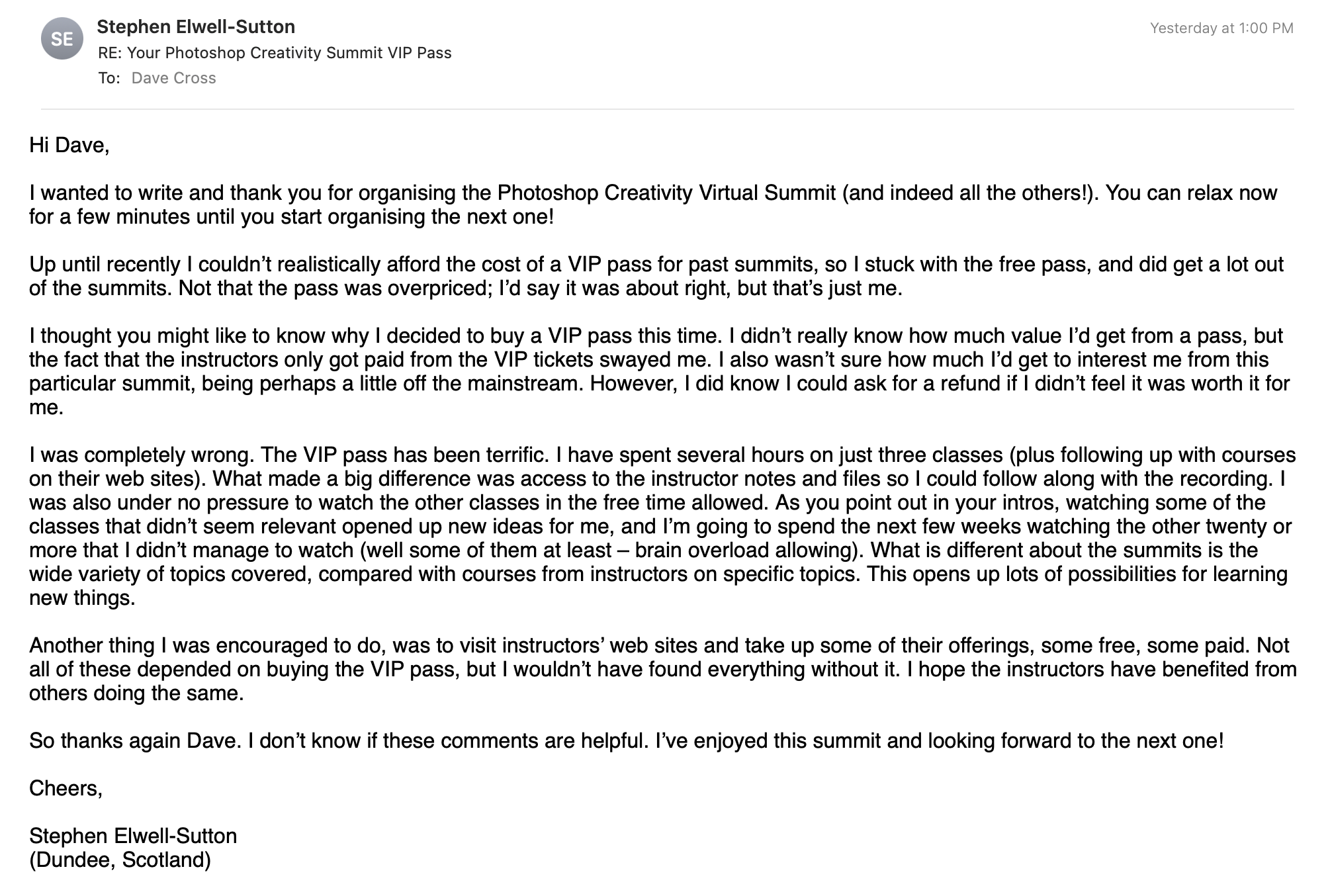 The VIP Pass for the Photoshop Creativity Virtual Summit is only available until March 28th. After that, the VIP Pass will no longer be available.